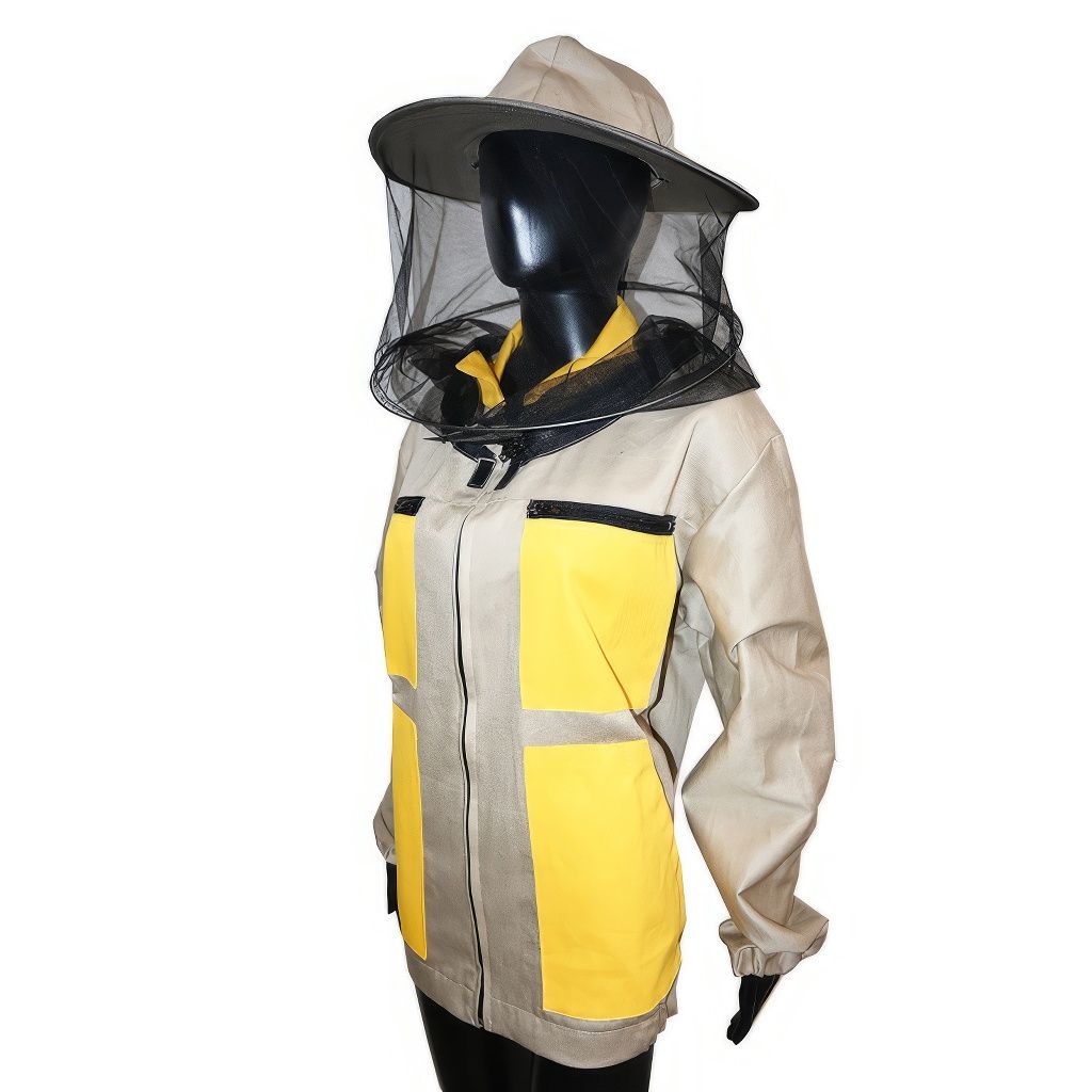 Včelařská blůza je vyrobena z bavlněné tuhé tkaniny, která poskytuje optimální kombinaci odolnosti a prodyšnosti, a spodní část blůzy a okraje rukávů jsou pečlivě staženy gumičkou pro maximální ochranu. Klobouk je spojen s blůzou odepínatelným kvalitním zipem, což umožňuje snadnou údržbu a případné oddělené praní obou částí.