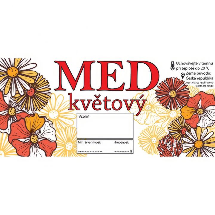 Samolepící etiketa MED. Pěkná a kvalitní samolepící etiketa, která dokonale ozdobí vaši sklenici s medem a dodá jí profesionální vzhled. Tato etiketa je speciálně navržena pro větší nádoby, ideálně pro 500g a objemnější sklenice. Díky svému povrchu je etiketa velmi snadno popisovatelná, což vám umožňuje jednoduše doplnit důležité informace jako minimální trvanlivost produktu a přesnou gramáž balení podle vašich potřeb. Pro označení můžete také bez problémů využít razítko, které na povrchu etikety zanechá jasný a trvalý otisk. Nabízíme vám tyto barevné matné samolepící etikety v praktickém rozměru 11 x 5 cm, který poskytuje dostatek prostoru pro všechny potřebné údaje. Z logistických důvodů je možné tyto etikety objednávat pouze v balení po 100 kusech, což je ideální množství pro včelaře i drobné producenty medu.
