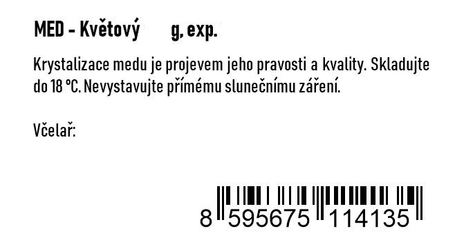 Etikety na med jsou dodávány na archu po 24 ks. Rozměr etikety je 70*36 mm. Informace na etiketě lze upravovat dle požadavku (do kapacity úhozů včetně mezer). Info etiketa na med je vhodná na malé i velké sklenice bez jiných etiket, s etiketou přes víčko (pečetí) nebo jako doplněk hlavní etikety.