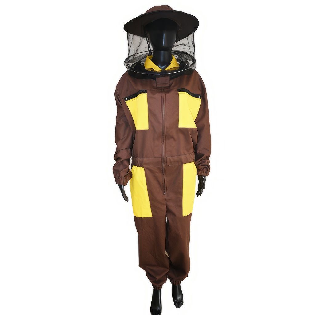 velikost: S až XXXL, poskytující dokonalou ochranu pro celou vaši postavu během práce se včelami. Tato profesionální včelařská kombinéza je vyrobena z mimořádně kvalitních a odolných materiálů, které byly speciálně navrženy tak, aby efektivně bránily včelím bodnutím a zajistily vám maximální bezpečí při manipulaci s včelstvy. Prakticky řešené rukávy jsou navrženy s důmyslným systémem, který umožňuje jejich pohodlné založení do včelařských rukavic, čímž vytvoříte nepropustnou bariéru zabraňující včelám dostat se k vaší pokožce a ohrožovat vás v oblasti rukávů. Kombinéza je ergonomicky tvarovaná, takže skvěle padne téměř každé postavě, a její elegantní hnědo-žluté barevné provedení nejen že vypadá profesionálně, ale také prakticky při práci v terénu.Včelařská kombinéza disponuje pečlivě navrženými dlouhými nohavicemi, které se dají velice prakticky a bezpečně zasunout do vysoké včelařské obuvi, čímž vytvoříte účinnou bariéru proti včelám. Toto promyšlené řešení efektivně zabraňuje situacím, kdy by spadlé nebo rozdrážděné včely mohly vylézat po vašich nohou a způsobit nepříjemná bodnutí. S naší komplexní včelařskou kombinézou s integrovaným kloboukem získáváte spolehlivého ochranného pomocníka, díky kterému se můžete s klidem a sebejistotou věnovat práci i v přítomnosti těch nejagresivnějších včelstev nebo během náročnějších včelařských úkonů, kdy jsou včely přirozeně podrážděnější.