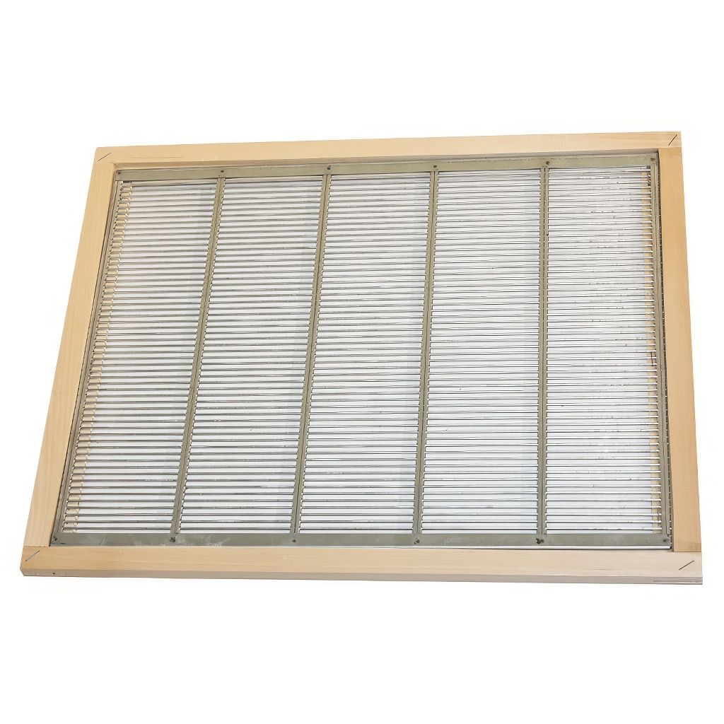 Vysoce kvalitní kombinovaná kovová mřížka zasazená v robustním dřevěném rámu pro maximální stabilitu a dlouhou životnost. Mřížka je důkladně pozinkovaná, což zajišťuje vynikající odolnost proti korozi a povětrnostním vlivům. Vnější rozměr celé mřížky činí 420 x 520 mm, což ji činí ideální volbou pro nástavky obsahující 10 rámků typu Zander. Alternativně ji lze také perfektně využít pro 12 standardních německých rámků (DNM), což poskytuje včelaři flexibilitu při používání různých typů úlů.