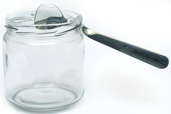 Lžička na med tvarovaná pro přichycení na sklenice. Z takto umístěné lžičky med nekape na stůl.