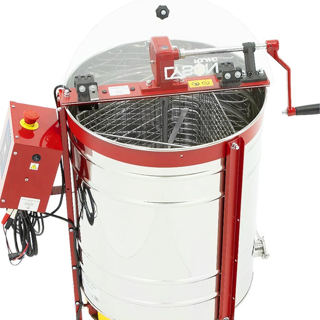 Elektromotor je umístěn ve spodní části medometu, což přispívá k nízko položenému těžišti a stabilitě při provozu. Velkou výhodou je možnost napájení jak ze sítě 230 V, tak z 12V zdroje – medomet tak můžete bez problémů používat i přímo na stanovišti bez přístupu k elektrické síti. Plynulá regulace otáček vám umožní jemně přizpůsobit rychlost vytáčení podle stavu plástů a zabránit jejich poškození.