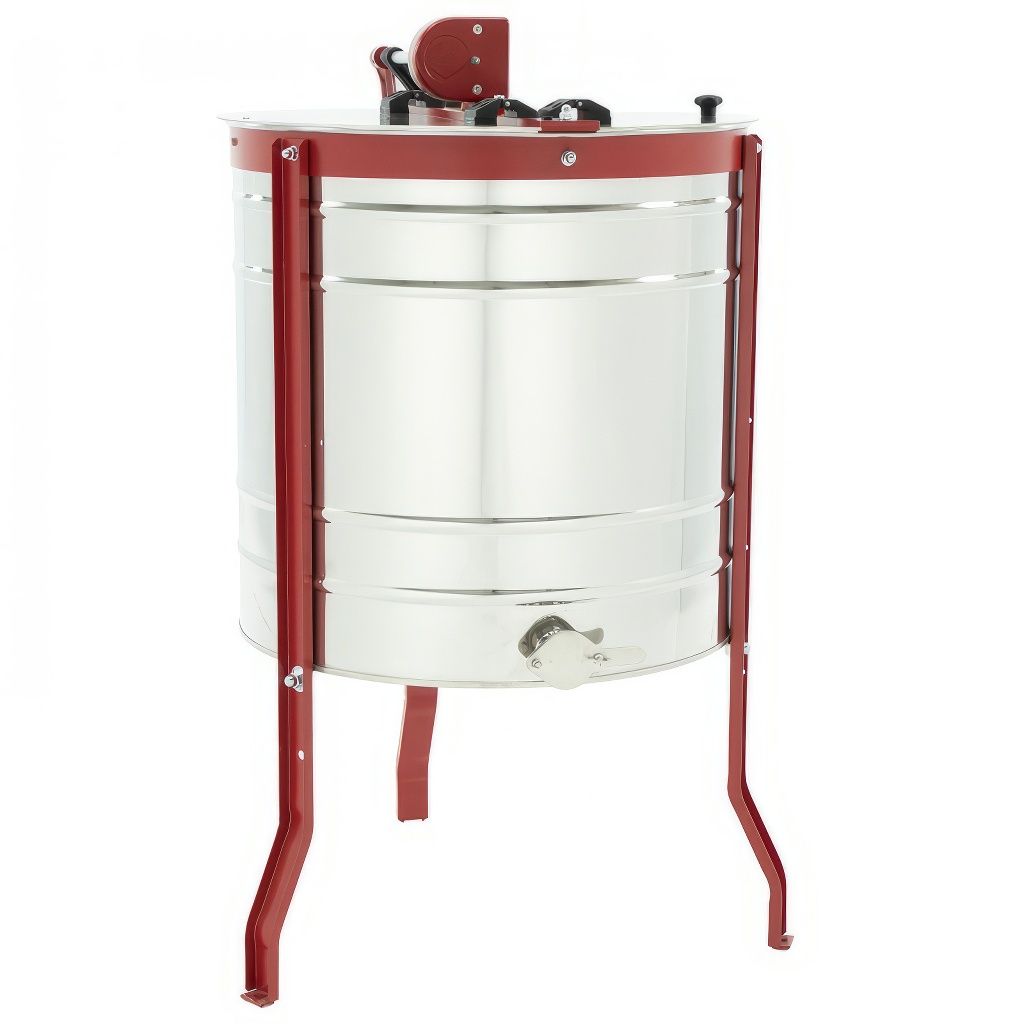 Medomet tangenciální nerezový pro čtyř rámky. Tento kvalitní včelařský medomet s ručním pohonem je ideálním pomocníkem pro každého včelaře. Rozměry koše 35 x 45 cm poskytují dostatečný prostor pro efektivní vytáčení medu. Čtyř rámkový medomet s průměrem nádoby cca 61 cm zaručuje stabilitu při práci. Výška medometu i s kovovým podstavcem je cca 100 cm, což zajišťuje pohodlnou manipulaci. Výška od kohoutu na zem cca 40 cm umožňuje snadné umístění nádob pro stáčení medu. Naše medomety jsou dodávány s plnou 2 letou zárukou, což odráží naši důvěru v kvalitu produktu. Nabízíme pro naše zákazníky kompletní záruční i pozáruční servis, který zahrnuje veškerou potřebnou podporu. Zprostředkováváme možnost výměny a dodávky náhradních dílů, takže se nikdy nemusíte obávat, že by váš medomet zůstal nefunkční. Medomety mají evropský certifikát jakosti a bezpečnosti certifikát CE, což garantuje jejich bezpečné používání a dlouhou životnost. Záruka 24 měsíců. Všechny části medometu které přijdou do styku s medem jsou vyrobeny kompletně z nerezu, což zajišťuje hygienickou čistotu a snadnou údržbu. Medomet má manuální pohon na kliku, který je navržen pro snadné a plynulé otáčení i při plném zatížení. Práce s medometem je snadná a jde dobře od ruky, i když nemáte předchozí zkušenosti. Nový medomet je určitě skvělá pomůcka pro každého včelaře, ať už začínajícího nebo zkušeného. Medomety jsou vyrobeny v EU.