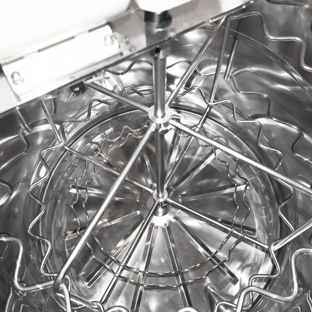 Radiální medomet na dvacet rámků s elektrickým pohonem 230 V o výkonu 110W nabízí efektivní a spolehlivé řešení pro včelaře. Šířka koše činí 25 cm, což zajišťuje, že medomet je ideálně vhodný pro většinu standardních rámků používaných v České republice. Tento vysoce kvalitní medomet je vyroben z pečlivě leštěných nerezových plechů, které splňují všechny potřebné atesty pro bezpečný styk s potravinami. Jedná se o vrcholné provedení s praktickým kónickým dnem a mnoha dalšími inovativními prvky, které usnadňují práci a zvyšují efektivitu vytáčení.