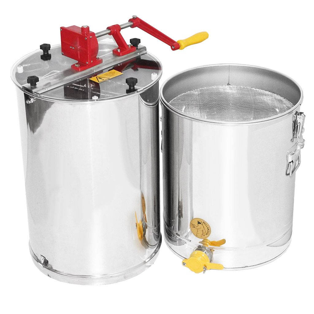 Tangenciální medomet na dva rámky s vlastní nádobou a sítem představuje komplexní řešení pro včelaře. Tento praktický medomet je pevně spojen s nádobou pomocí robustních svorek, což zajišťuje stabilitu během procesu vytáčení medu. Mezi medometem a nádobou je umístěno velkorysé síto o průměru 40 cm, které efektivně zachycuje nečistoty a vosk. Šířka koše dosahuje 34 cm, díky čemuž je tento medomet univerzálně použitelný pro většinu standardních rámků používaných v České republice. Nespornou výhodou tohoto promyšleného řešení je integrace všech potřebných komponentů - síta i nádoby - do jednoho kompaktního zařízení, což vám umožní v jediném pracovním procesu med vytočit, důkladně vycedit a následně stočit do připravených nádob.