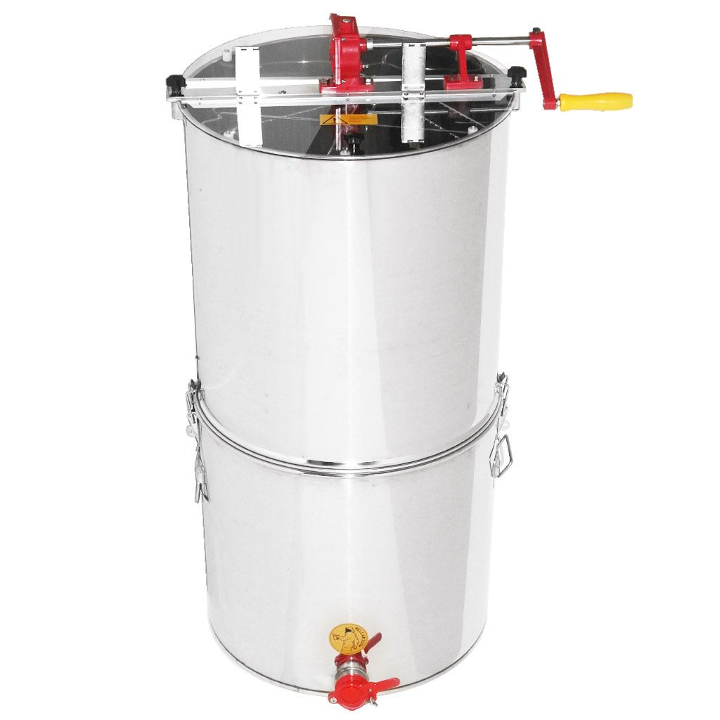 Tangenciální medomet na čtyři rámky s vlastní nádobou a sítem nabízí komplexní řešení pro včelaře. Tento praktický medomet je pevně spojen s nádobou pomocí robustních svorek, což zajišťuje stabilitu během procesu vytáčení medu. Mezi medometem a nádobou je umístěno velkorysé síto o průměru 52 cm, které efektivně zachycuje nečistoty a zajišťuje čistotu výsledného produktu. Šířka koše činí 29 cm, což umožňuje použití většiny standardních rámků používaných v českém včelařství. Hlavní předností tohoto promyšleného řešení je integrace všech potřebných komponentů - medometu, síta i nádoby - do jednoho kompaktního zařízení, díky čemuž získáte vše nezbytné pro kompletní proces vytočení, vycezení a následného stočení medu, a to bez nutnosti pořizovat další vybavení.