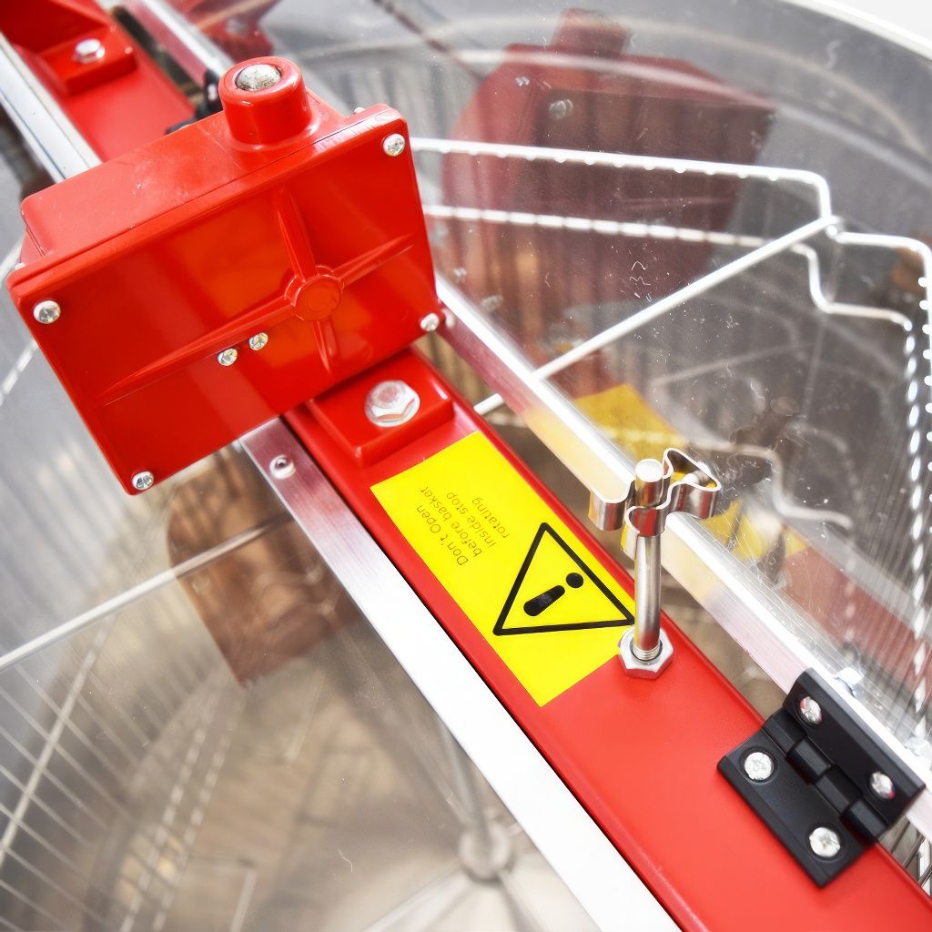 Standardně je medomet vybaven plastovým výpustným kohoutem, který lze snadno odšroubovat a důkladně umýt – hygiena při zpracování medu je na prvním místě. Pokud preferujete odolnější řešení, na vyžádání je možné medomet dodat s nerezovým kohoutem. Ruční pohon s brzdou vám umožní přesně regulovat rychlost otáčení a bezpečně zastavit buben v požadovaném okamžiku.
