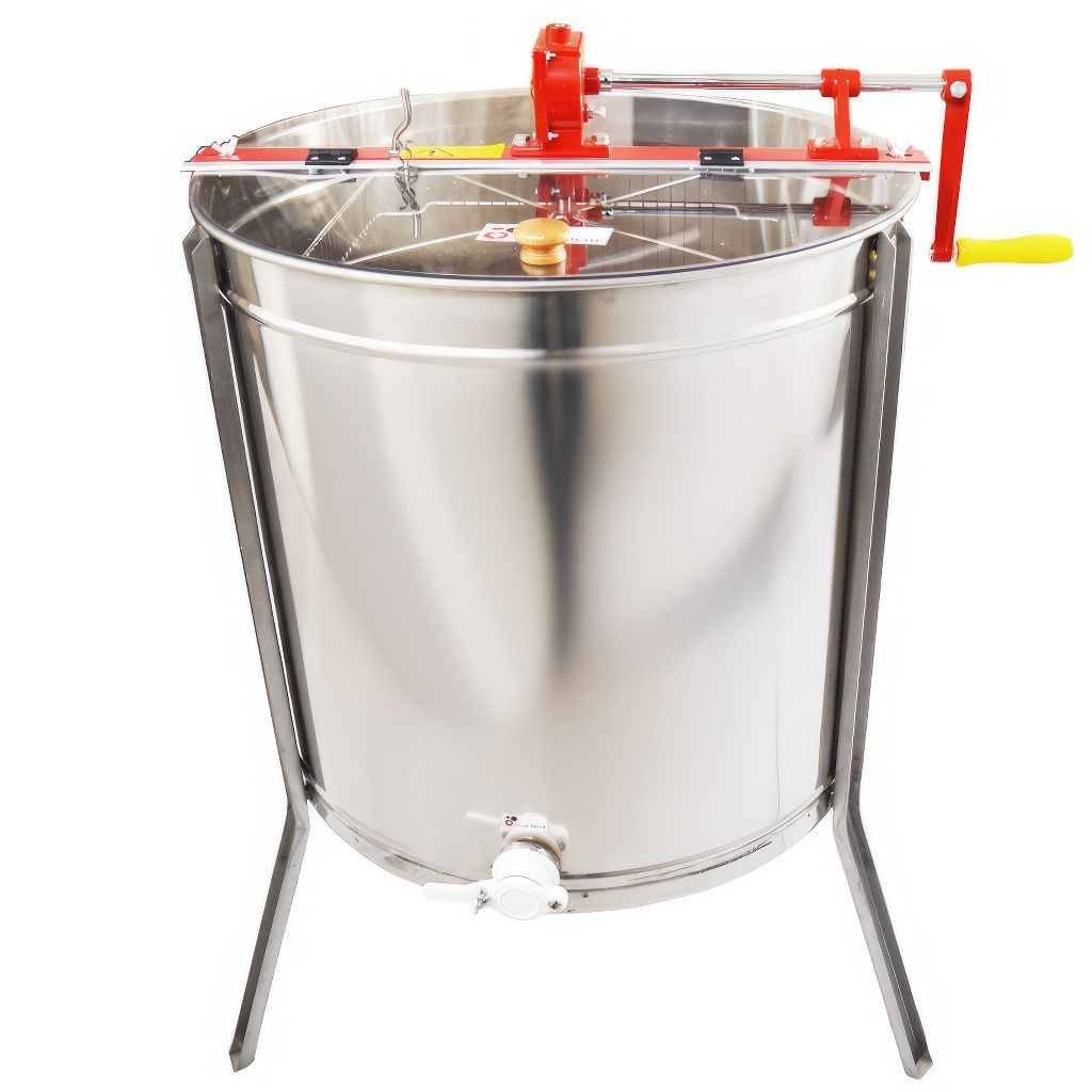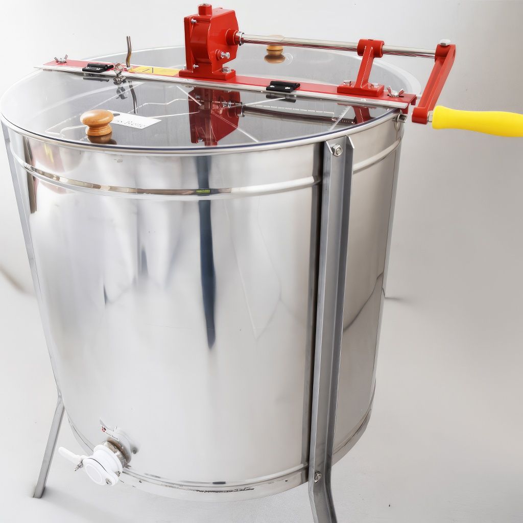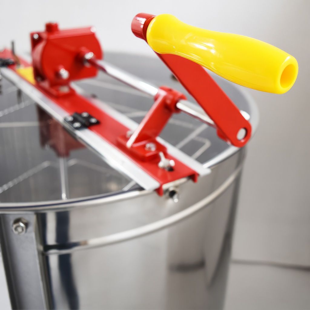 Standardně je medomet vybaven plastovým výpustným kohoutem, který lze snadno odšroubovat a důkladně umýt – hygiena při zpracování medu je na prvním místě. Pokud preferujete odolnější řešení, na vyžádání je možné medomet dodat s nerezovým kohoutem. Ruční pohon s brzdou vám umožní přesně regulovat rychlost otáčení a bezpečně zastavit buben v požadovaném okamžiku.