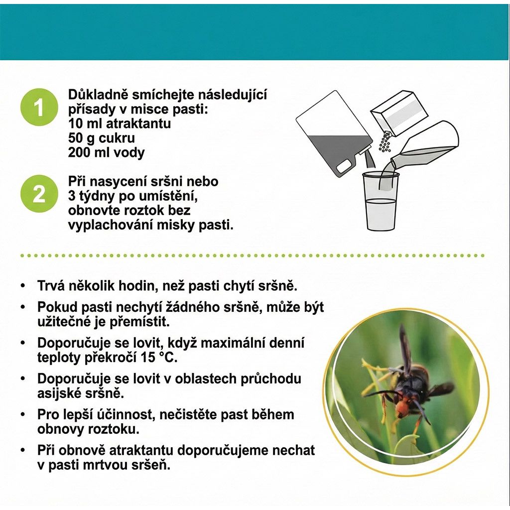 Aktivace: Než začne být past pro sršně atraktivní, může to trvat i několik hodin. Pokud je odchyt slabý, změňte umístění.