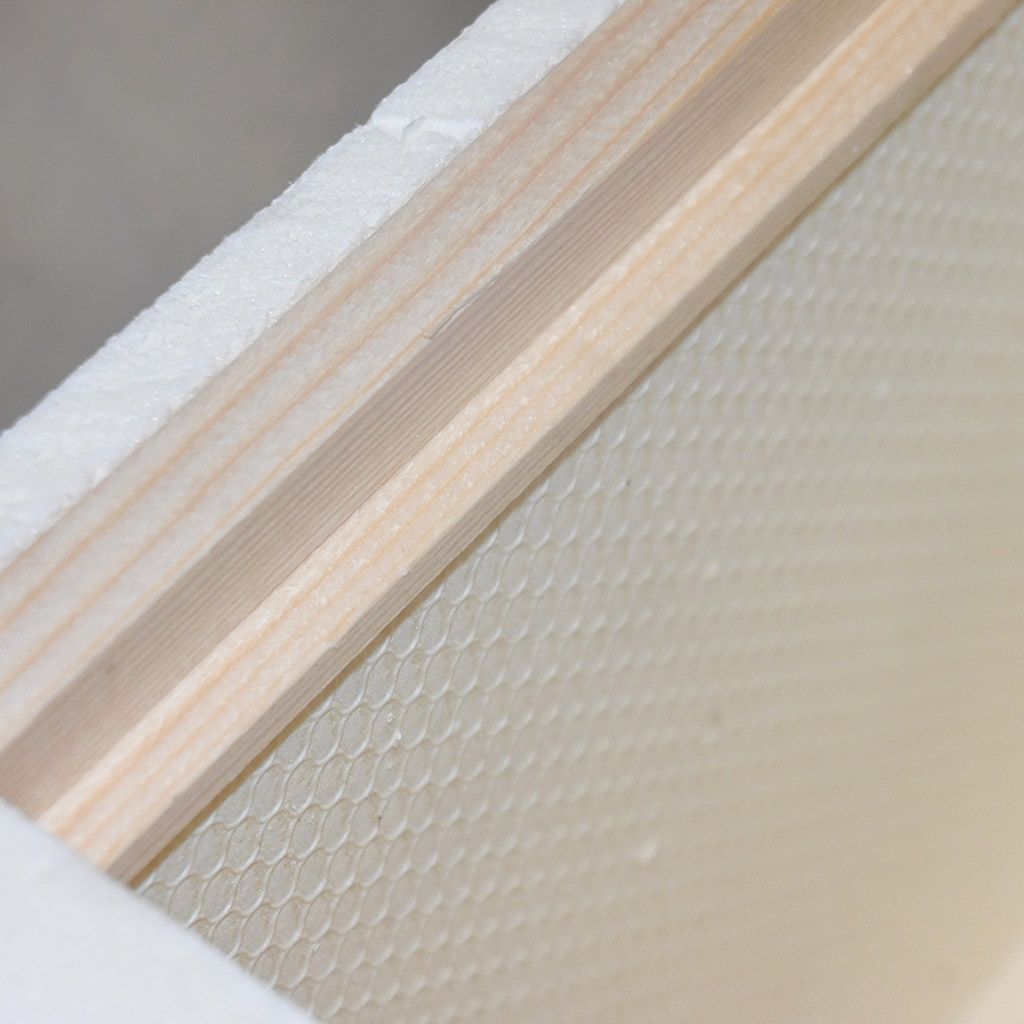 Celý plemenáč je postaven ze 30mm styrodurových stěn, které výborně brání únikům tepla i nežádoucímu přehřívání. V chladných nocích a při jarních teplotních výkyvech si včelstvo udrží potřebné teplo, aniž by muselo spalovat nadměrné množství zásob. V horkých letních dnech zase izolace tlumí přehřívání zvenčí. Víko je zateplené stejnou vrstvou polystyrenu a z vnější strany chráněné pozinkovaným plechem, který odolává dešti, UV záření i mechanickému poškození – plemenáč tak spolehlivě slouží sezónu za sezónou.