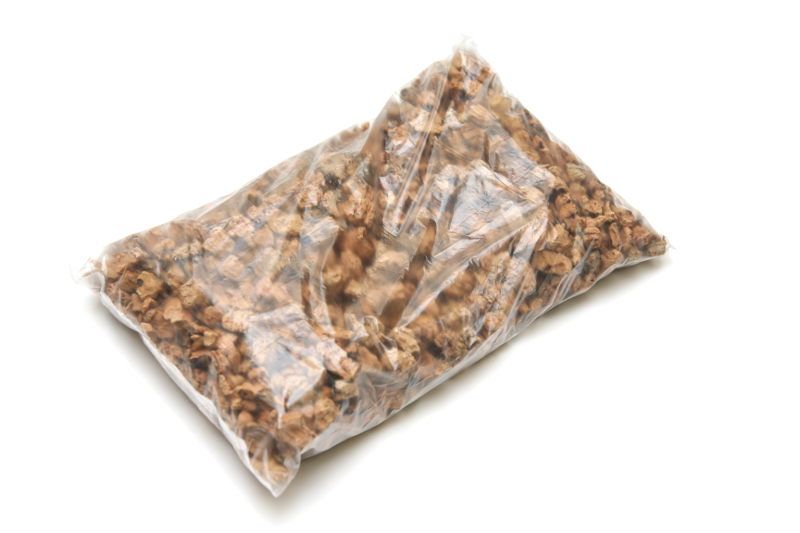 Korková drť pro krmítka vyráběná včelaři svépomocí. Korková drť plave na hladině roztorku a tím zamezuje utopení včel.