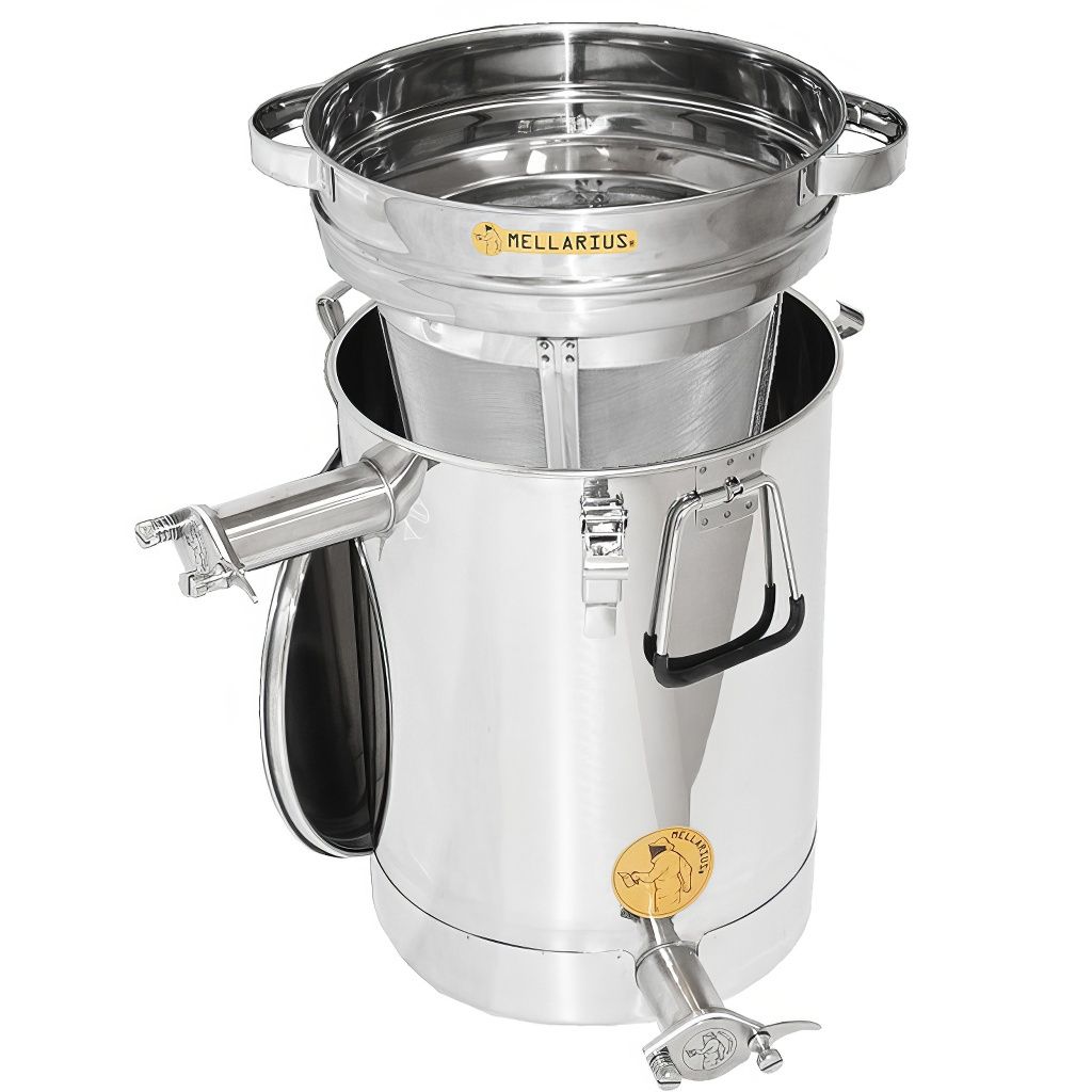 Nádoby na med Mellarius přicházejí v několika pečlivě navržených variantách, přičemž tento konkrétní model se pyšní prakticky vyspádovaným dnem, dokonale těsnícím víkem a dvěma profesionálně navařenými nerezovými kohouty, které významně rozšiřují možnosti využití a umožňují nádobu efektivně používat jako čeřící nádobu na med. Tyto kvalitní nádoby jsou vyráběny výhradně z prvotřídní nerezové oceli, speciálně certifikované pro potravinářské účely, s promyšlenou tloušťkou materiálu (0,8 až 1 mm), která poskytuje optimální odolnost proti nežádoucím deformacím a promáčklinám při každodenním používání. Všechny komponenty a spojovací části nádob jsou precizně a trvale spojeny pomocí moderní technologie plazmového svařování, zajišťující maximální pevnost a dlouhou životnost. Při návrhu a výrobě je kladen mimořádný důraz na dokonale hladké povrchy, které umožňují snadné a důkladné čištění po každém použití, proto jsou nádoby vyrobeny výhradně z pečlivě leštěných nerezových plechů nejvyšší kvality. Pro komfortní manipulaci jsou všechny naše nádoby standardně vybaveny ergonomicky tvarovanými nerezovými madly, která usnadňují přenášení i při plném zatížení. Součástí kompletního balení je také speciálně navržené nerezové síto, které můžete jednoduše vložit do nádoby a ve spojení s horním kohoutem tak efektivně využívat celý systém jako profesionální čeřící nádobu.