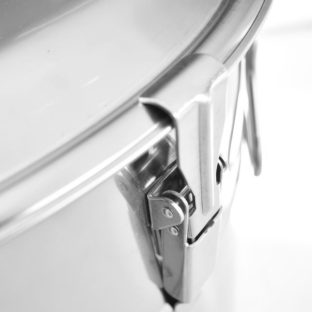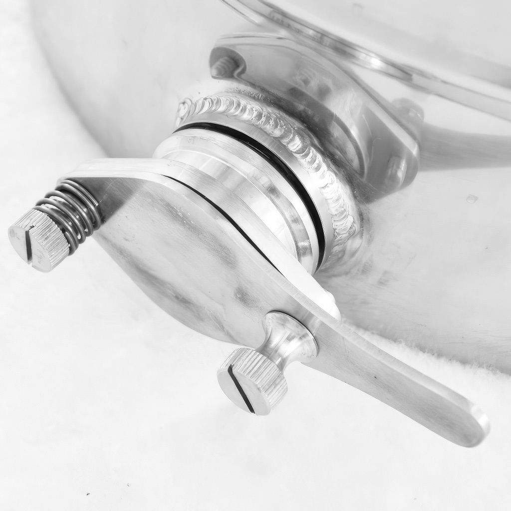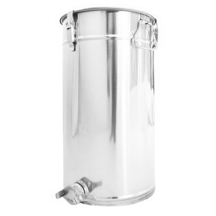 Nádoba je kompletně vyrobena z potravinářské nerezové oceli, která zaručuje dlouhou životnost, snadnou údržbu a hygienickou nezávadnost při kontaktu s medem. Součástí je nerezový stáčecí kohout (ventil) pro pohodlné a přesné plnění sklenic. Nádoba je doplněna nerezovým víkem, které lze pevně uchytit k tělu nádoby, čímž je med spolehlivě chráněn před nečistotami a vlhkostí.