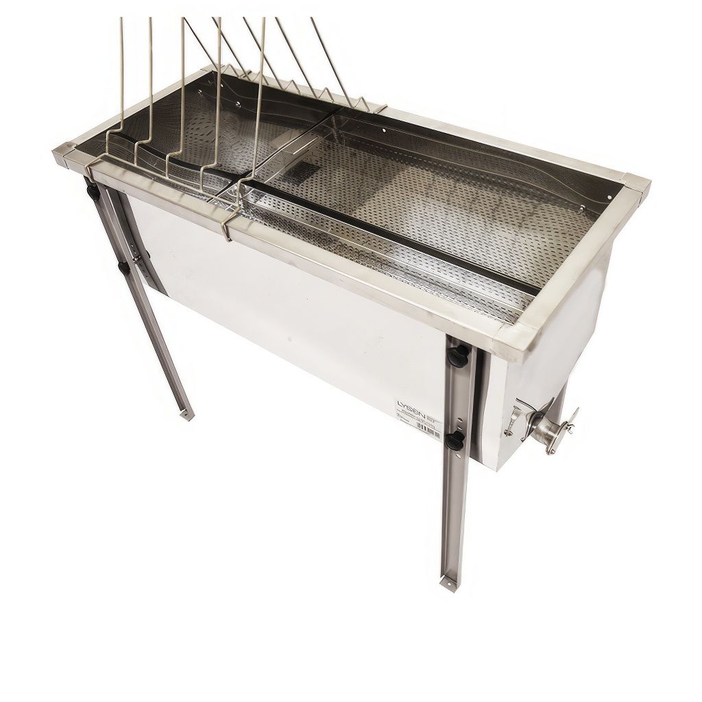 Odvíčkovací stůl s nerezovou vanou a sítem - profesionální řešení pro efektivní odvíčkování. Tento praktický a jednoduchý odvíčkovací stůl je univerzálně navržen pro všechny typy včelařských rámků. Vysoce kvalitní nerezová vana představuje ideální řešení zejména pro včelaře, kteří hospodaří s větším počtem včelstev a potřebují zpracovávat větší množství medu najednou. Vana je vybavena odolným nerezovým stáčecím kohoutem, který umožňuje snadné vypouštění medu. Významnou součástí celého systému je pečlivě zpracované síto pokrývající celou plochu dna, které efektivně zachycuje vosk a nečistoty. Jednou z hlavních předností tohoto odvíčkovacího stolu je možnost současné práce dvou včelařů, kteří mohou pohodlně odvíčkovávat z obou stran vany, což výrazně urychluje celý proces zpracování medu. Po dokončení odvíčkování můžete rámky jednoduše zavěsit přímo ve vaně, kde zůstanou připraveny na následné vytáčení.