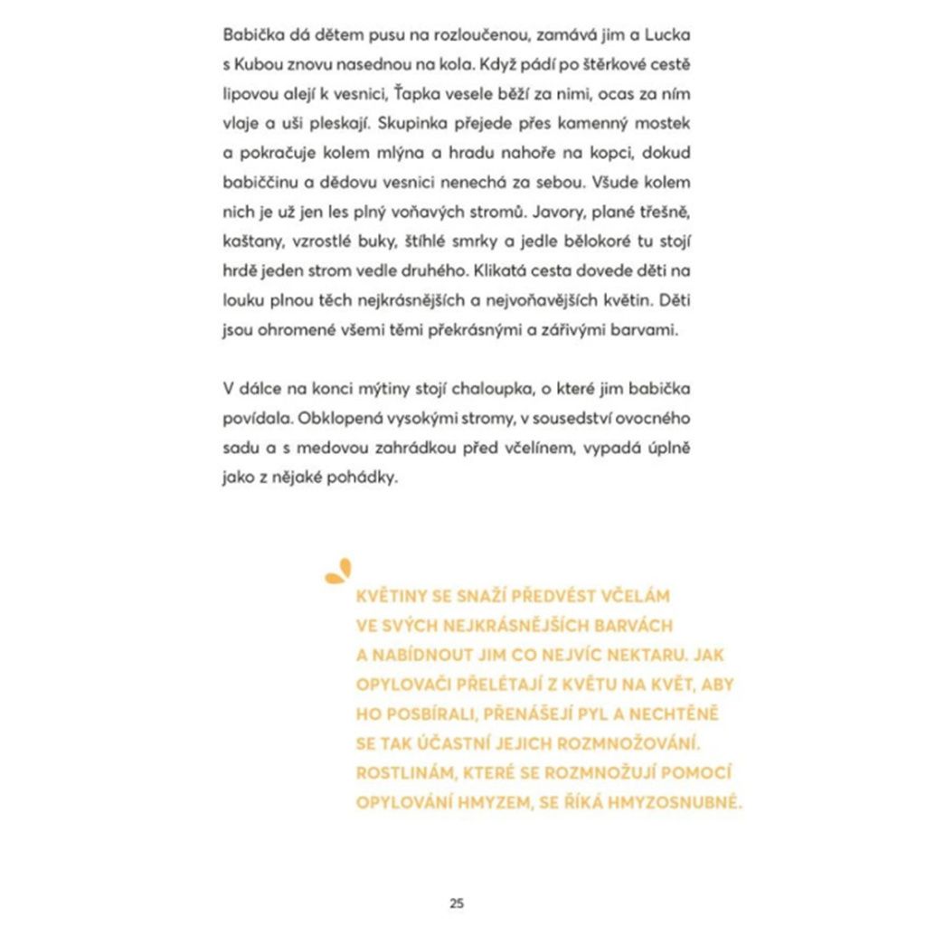 Každá kapitola této knihy přirozeně propojuje dětské dobrodružství s poznatky o významu včel v ekosystému – od opylování rostlin, přes důležitost čistého životního prostředí, až po využití včelích produktů pro naše zdraví. Děti se dozví, proč je třeba nejprve včelám pomáhat, aby nám pak mohly svými dary – medem, propolisem, pylem a voskem – oplatit péči mnohonásobně.