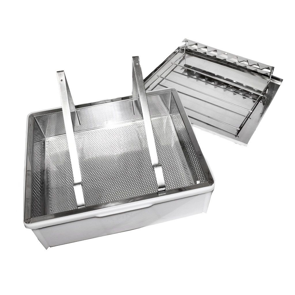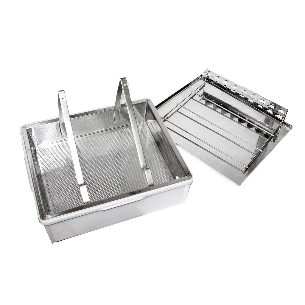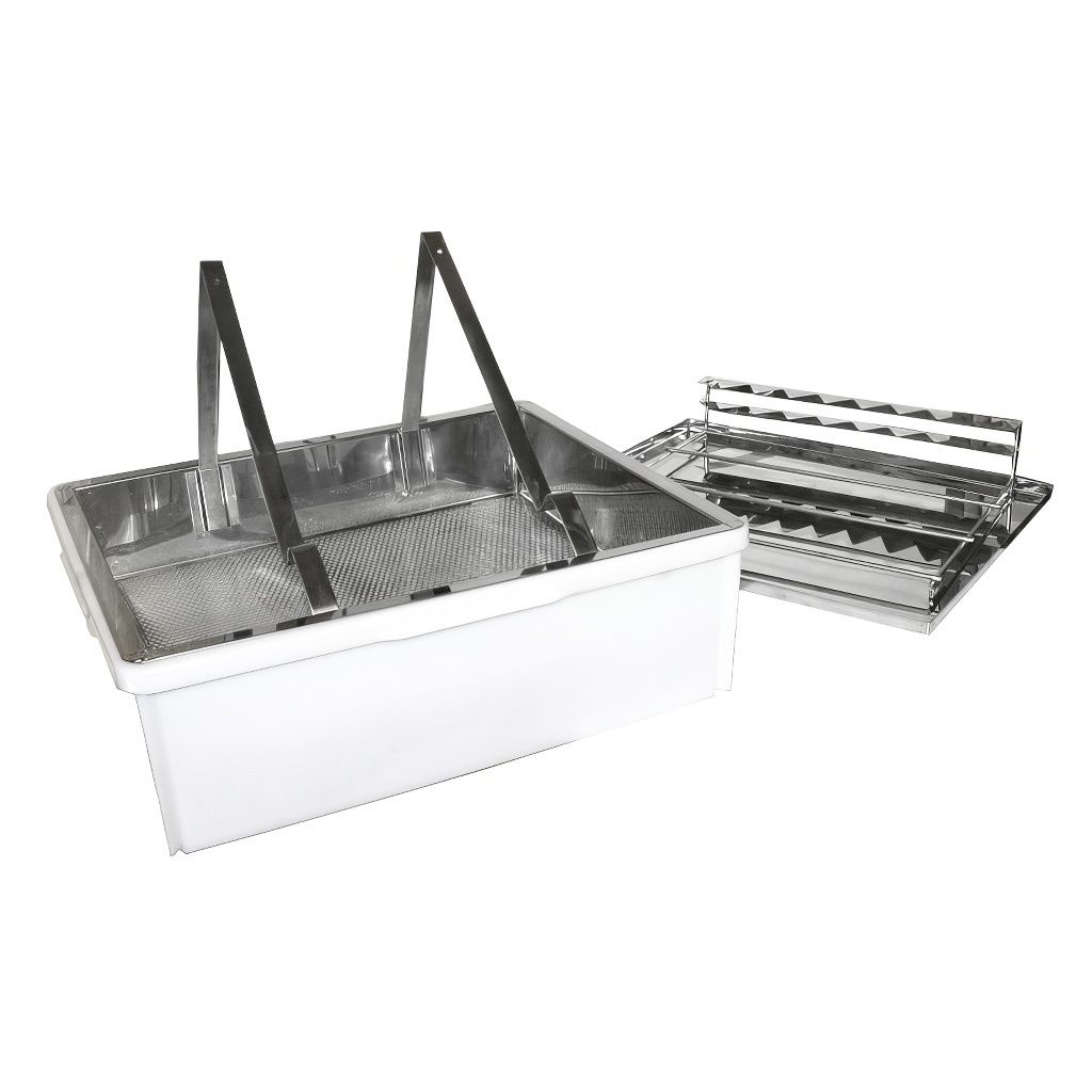 Odvíčkovací talíř navržený speciálně pro jeden rámek (plást) v praktické kombinaci plastu a nerezu. Kvalitní plastová vanička je vybavena odolným nerezovým sítem a robustními držáky, které zajišťují stabilitu během práce. Pro maximální pohodlí a efektivitu při odvíčkování je celá sada chytře doplněna o prostorný nerezový podnos, který slouží k bezpečnému odkládání rámků během procesu. Tento jednoduchý, ale mimořádně kvalitní odvíčkovací talíř od renomované značky ApiNord zaručuje nejen snadnou manipulaci, ale díky promyšlené konstrukci s plastovou vaničkou také bezproblémové a rychlé čištění po každém použití. Zkušení včelaři obzvláště oceňují nadstandardně vysokou vaničku, která výrazně usnadňuje práci a minimalizuje riziko rozlití medu při odvíčkování.