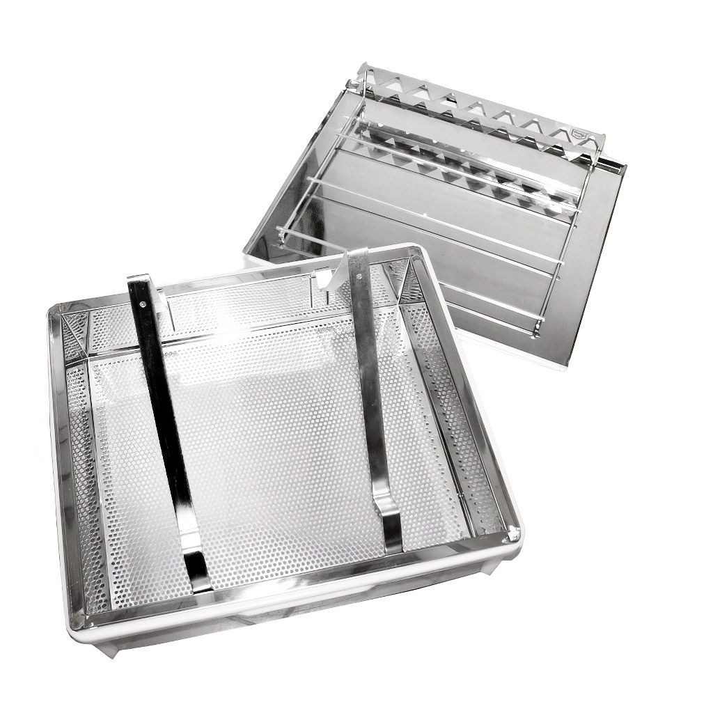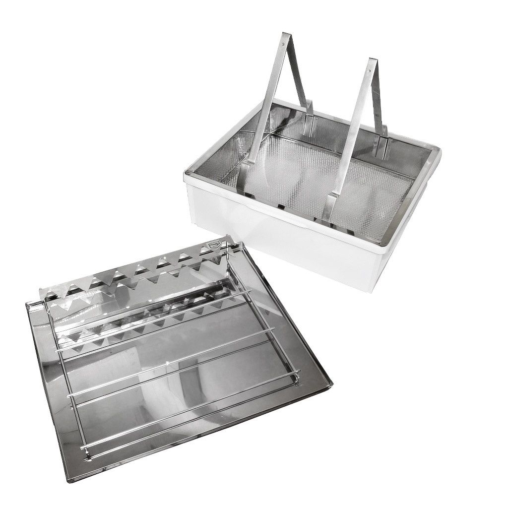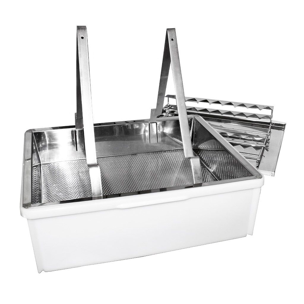 Tento kvalitní odvíčkovací talíř představuje dokonalou harmonii mezi moderním plastovým materiálem a odolnou nerezovou ocelí. Je speciálně navržen pro efektivní odvíčkovávání dvou plástů současně, což výrazně urychluje práci včelaře. Prostorná a hluboká vanička vyrobená z prvotřídního, odolného plastového materiálu je pečlivě doplněna o bytelné nerezové držáky a jemné síto. Součástí této promyšlené sady je také elegantní nerezový podtác, který slouží jako mimořádně praktický a užitečný doplněk celého systému, usnadňující manipulaci s medem během odvíčkovávacího procesu.