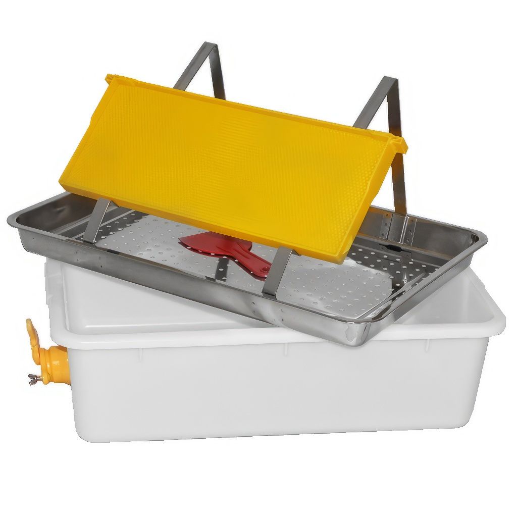 Do precizně děrované nerezové vany jednoduše zasadíte přibalené stabilní nohy, na které si medové plástve bezpečně postavíte. Pro ještě efektivnější práci důrazně doporučujeme dokoupit doplňkový odkládací tác, nebo rovnou investovat do celého kompletu i s praktickým odkládačem plástů, který vám usnadní celý proces vytáčení medu. Kombinace všech komponentů vytvoří dokonalý systém pro efektivní odvíčkování.