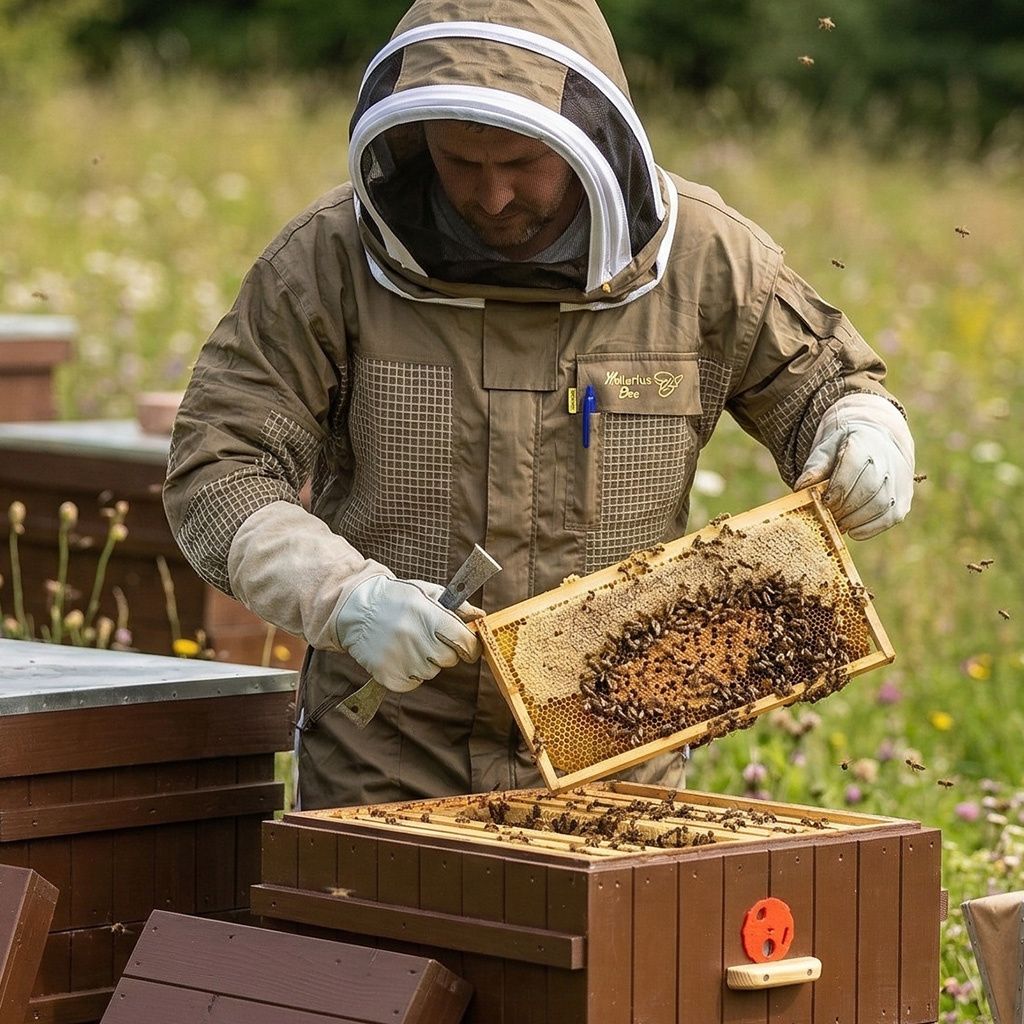 Značka Mellarius představuje špičku v oblasti ochranného oblečení pro včelaře. Každý oblek prošel důkladným vývojovým procesem, který vychází z několikaletého sbírání zpětné vazby od německých včelařů. Výsledkem je promyšlený produkt, který kombinuje maximální ochranu s praktičností a dlouhou životností. Všechny materiály jsou pečlivě vybírány s důrazem na odolnost – na namáhaných místech je tkanina zesílena přídavnou vrstvou a síťovina je vyrobena ze zpevněného materiálu odolného proti protržení.