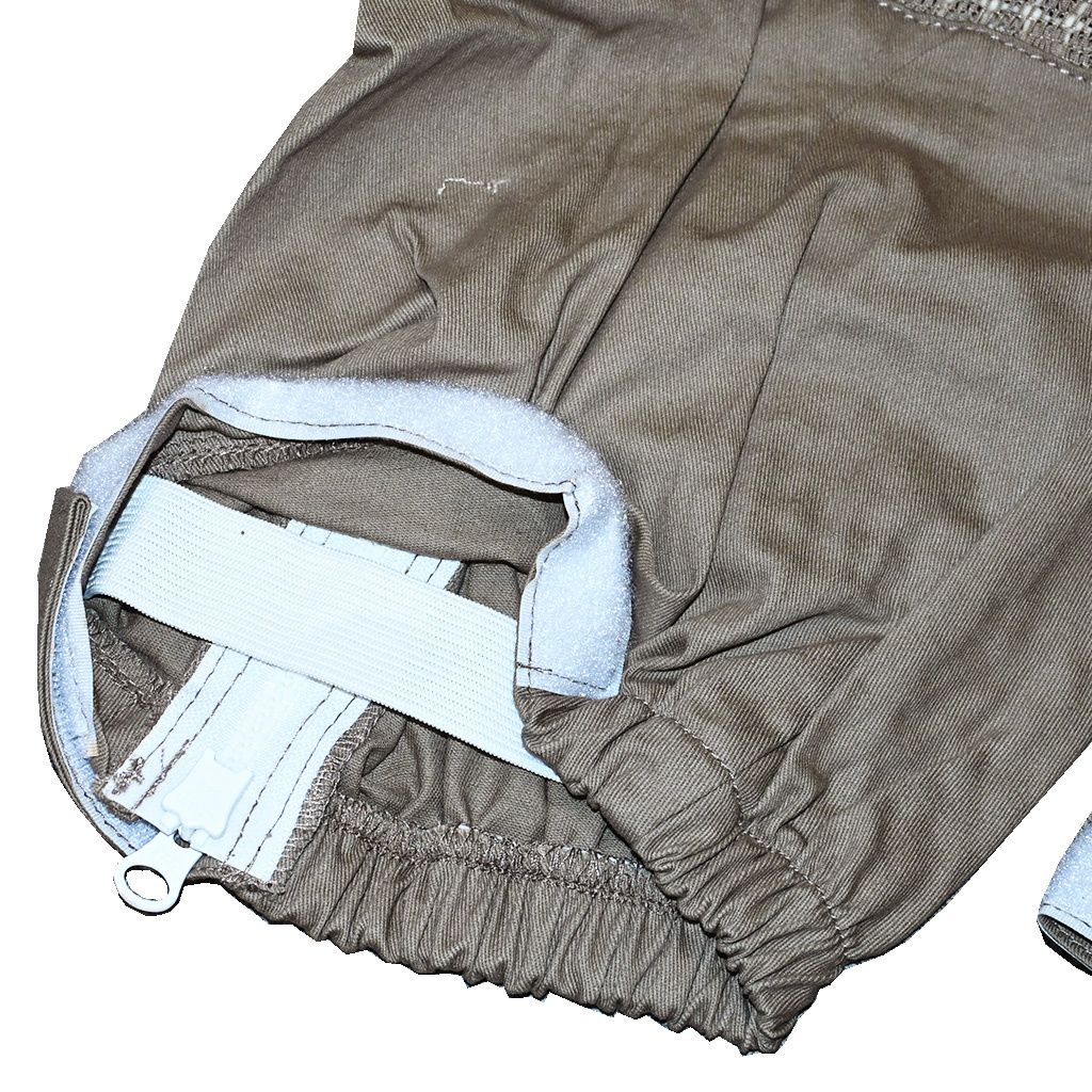 Zesílená kolena: V oblasti kolen jsou nášivky z odolné průmyslové tkaniny, které prodlužují životnost obleku při klečení a práci u úlů.