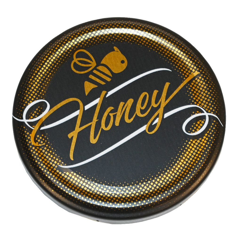 Šroubovací víčko vzor Honey - černé - matné - HO12-2 na sklenice Včela 730 ml, Facette 720 ml, Fass 720 ml, Facette 580 ml a Facette 420 ml. Graficky velmi pěkně zpracované víčko pro standardní sklenice, které se používají pro stočený med. S tímto víčkem svému medu určitě ostudu neuděláte. Celé balení obsahuje 700 kusů.